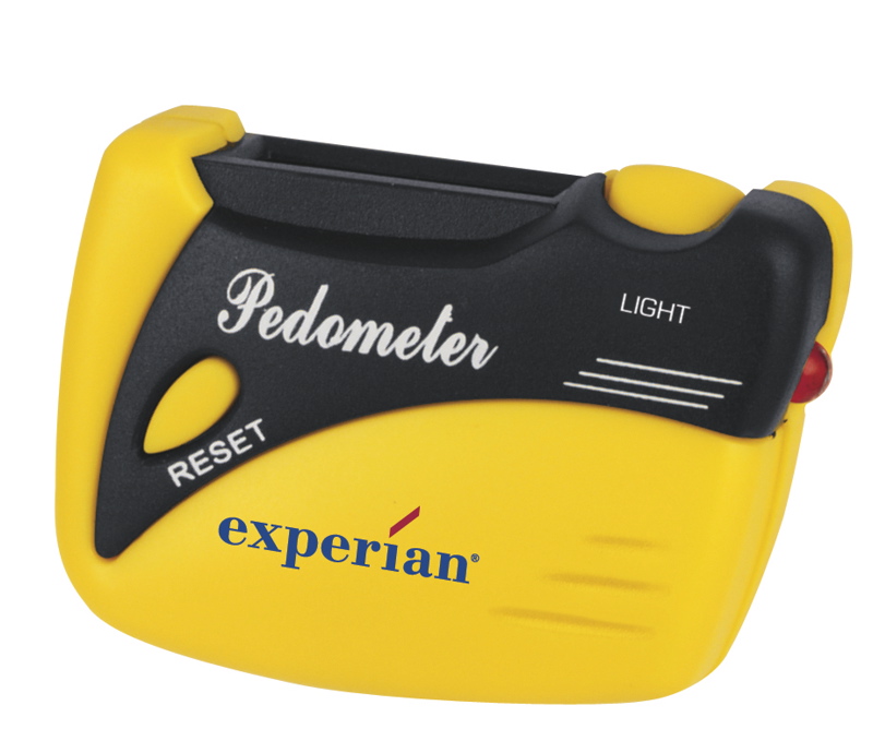 The hand-held pedometer features a red LED light, a belt clip and a reset button, and comes in silver and yellow with black trim. Imprints appear on the bottom corner of the pedometer on a space measuring 5⁄8×3⁄8″.