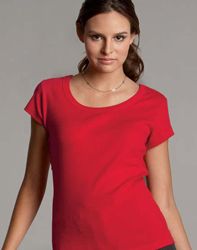 The contoured fit Ladies’ Short-Sleeve Scoop-Neck T-shirt by Bella has a cover-stitched baby bottom hem and sleeve hems. The T-shirt features a 3/4″ neck binding and is available in sizes S to 2XL. Look for it in white, baby blue, black, chocolate, navy, pink, plum and red.
