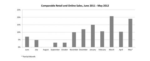 American Apparel, the Los Angeles vertically integrated manufacturer, distributor and retailer of branded fashion basic apparel, announced preliminary comparable sales for the period May 1, 2012 through May 26, 2012. The company reported that for the period May 1, 2012 to May 26, 2012, comparable store sales increased 19 percent, including a 19 percent increase in comparables store sales for its retail store channel and an 18 percent increase in net sales for its online channel. The company will announce full month comparable sales, wholesale net sales and total net sales for the month ended May 31, 2012 on Thursday, June 7, 2012 after the stock market closes.