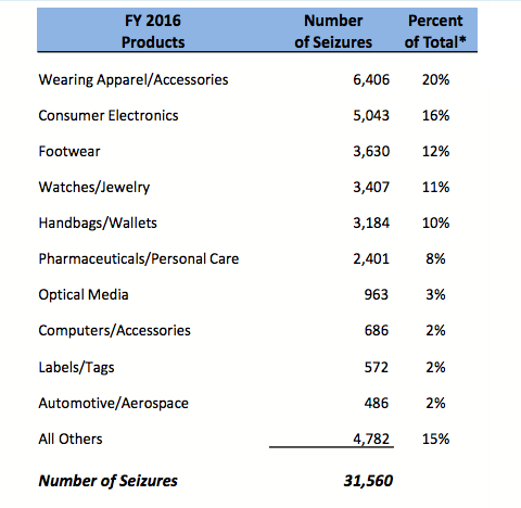 According to the statistics, apparel and accessories were the most-counterfeited items, accounting for 20 percent of the total seized items. Consumer electronics was close behind, with just about 1,000 fewer seizures.