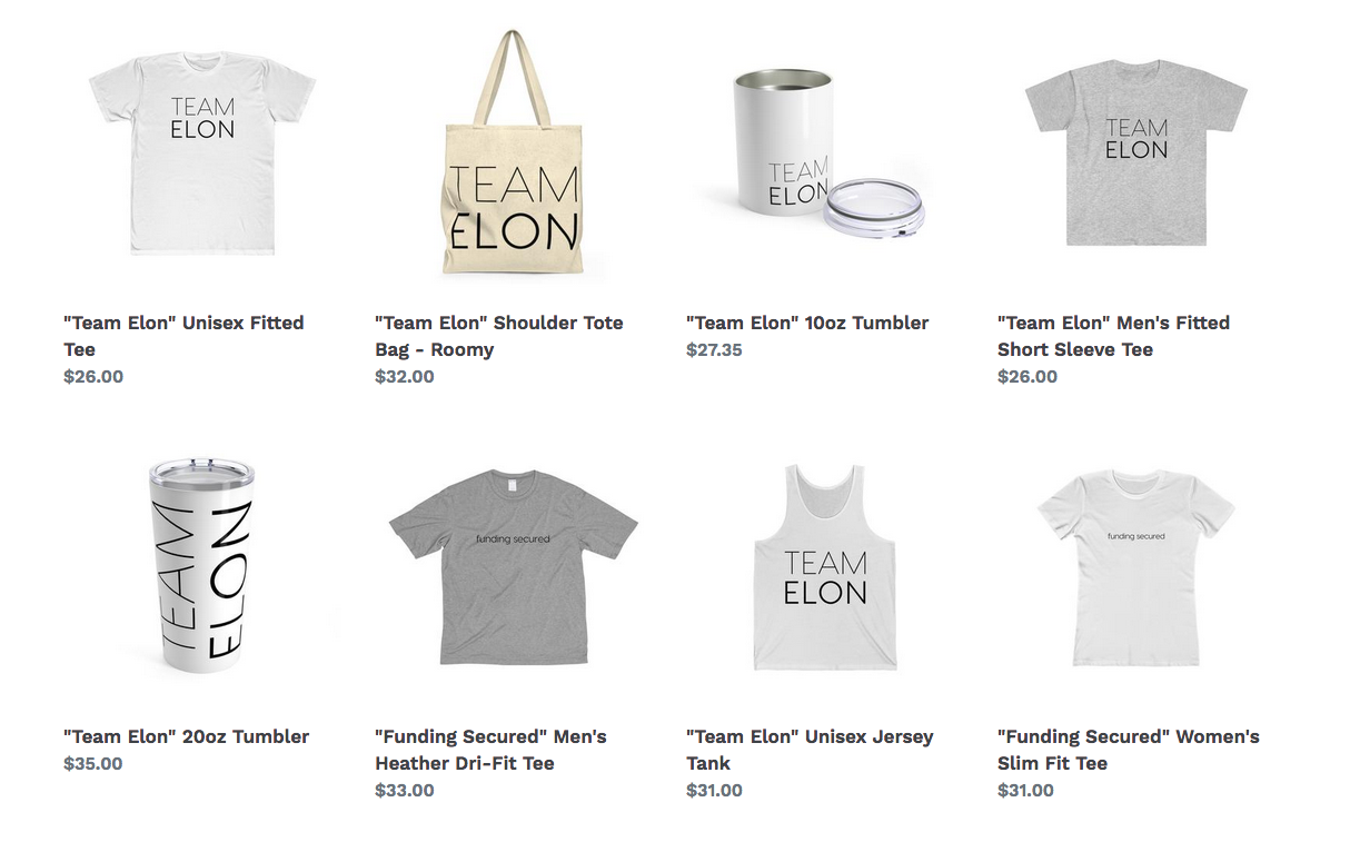 The former group started Team Elon, a Shopify store selling branded merchandise ostensibly aimed at supporting Musk, a billionaire, in his fight against the SEC. It’s kind of like the “Save Ferris” memorabilia from “Ferris Bueller’s Day Off,” only if instead of a lovable ’80s goofball Ferris was an ultra-rich entrepreneur smoking weed on podcasts and going on Twitter rants.