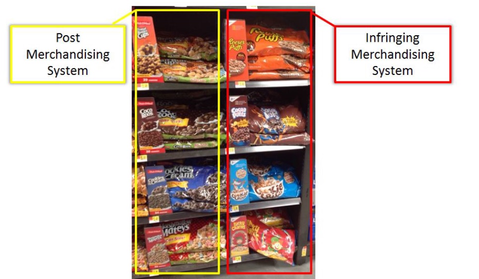 In fact, its director of corporate communications, Linda Fisher, holds that her employer’s 2016 decision to create plastic dividers with a trapezoidal-like front panel—so as to display Malt-O-Meal lines in vertical columns—likely helped its bagged cereal sales to jump 6 percent over the last year. When Post introduced the partitions, it placed “Patent pending” notices on them, so once legal clearance came through yesterday, the company, founded in 1895 as Postum Cereals, made good on a promise to fend off what it perceives as General Mills’ blatantly knocking off its idea after having dismissed the packaging as “too big for store shelves,” according to the lawsuit.