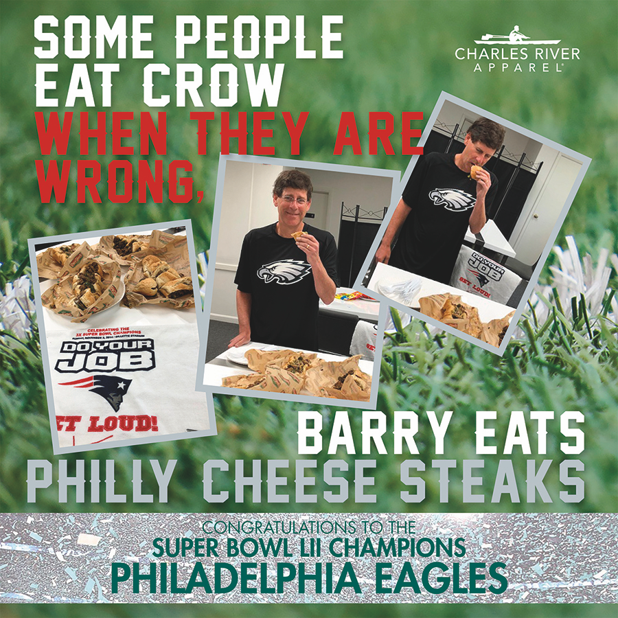 “Barry is an avid Patriots fan, and loves to have fun with his longtime customers,” said Tracy Lehnen of Charles River. “So, in the spirit of friendly competition, he wagered a few bets with some customers who happen to be big Eagles fans. The end result was not good for Barry and the Patriots, but he happily paid off his bets and congratulated his Philly fans and longtime customers. The bets ranged from sending Eagles sweatshirts, fresh New England clams and our favorite, eating a Philly cheesesteak while sporting an Eagles T-shirt.”