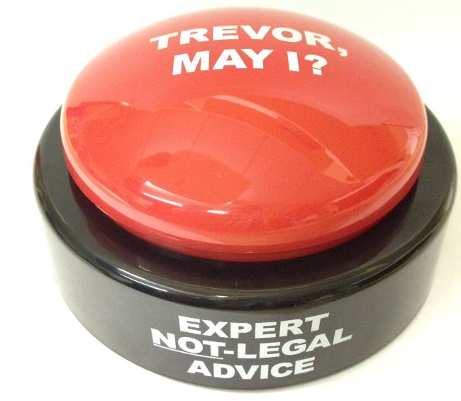 When pressed, the button plays Trevor’s voice giving the following advice: “I was hoping you wouldn’t ask that, because the answer is yes.” “I’m not entirely certain if that’s legal, but it would make for an interesting appeals process.” “If I were your lawyer I’d say no, but I’m a button so go nuts!” “Well, everything’s legal somewhere.” “Every time you press this button I’m billing you $200.”