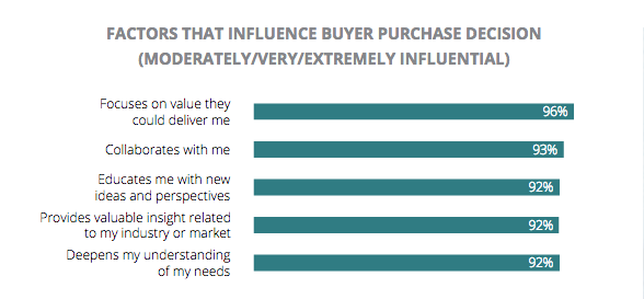 The bottom line? Converting cold meetings into sales comes down to value. “Focus on value they could deliver me” led the five listed points with a 96 percent moderately/very/extremely influential reaction. This makes evident, as the trio asserts, that “value converts to sales,” but the writers bluntly declare that “sellers aren’t delivering,” offering the 58 percent note as a sobering reflection of B2B sellers’ need to improve. How, though, can they prove their value to a potential client or sustain their relationships with trusting consumers? If we look at the fourth myth, we can see the answer is pretty apparent, as the authors state that, “According to buyers, insight and capabilities capture their attention,” and not that providing research and customized content to prospects will go a long way toward influencing the purchasing decision.