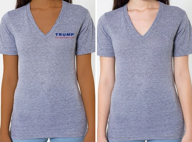 The photoshopped model appears in Trump’s campaign apparel store, while the original seems to come from the JCG Apparel website.