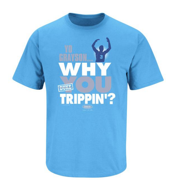 The shirts feature a silhouette with the number 3 in the middle, and the phrase “Yo Grayson … Why You Trippin’?” This is a reference to Allen’s multiple tripping incidents this season.