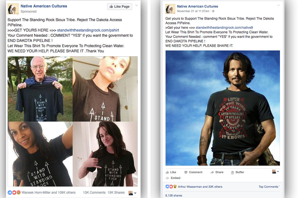 Buzzfeed tracked one particular page called “Like If You Love Native Americans,” which edits photos to look like big-name celebrities, like Dwayne “The Rock” Johnson, Johnny Depp and Mark Wahlberg, are wearing the T-shirts, but there’s no evidence that the owners donated any money to the protest effort.