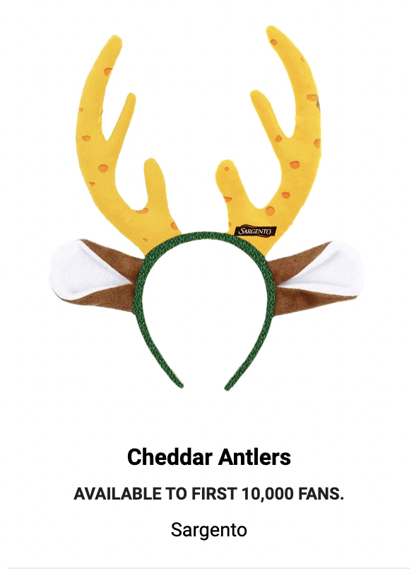 But what really stood out to us on the fun branding end is the “National Cheddar Day Antlers,” which are just a headband with antlers that look like they’re made of cheese, bringing in the Wisconsin cheese branding in with the Bucks’ logo. It’s the kind of thing where you just know everyone in the arena is going to want to wear it during the game, maybe doing something funny to end up on the big screen, and bring home to show their friends.