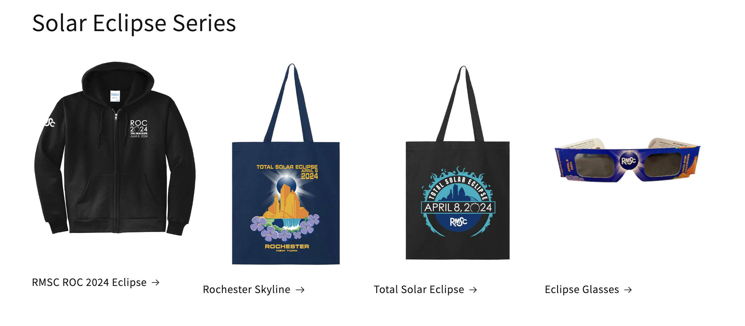 The museum’s Solar Eclipse series includes a sweatshirt with the museum’s logo and the eclipse’s date, two tote bags with artistic renderings of an eclipse over the Rochester skyline, and a set of paper eclipse glasses for safe sun-staring.