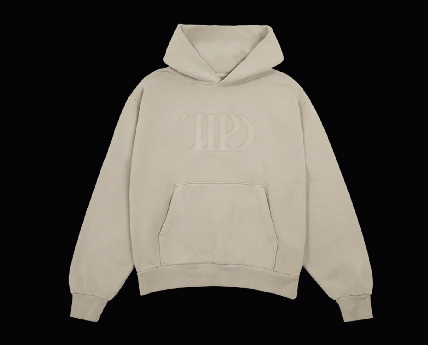 On the apparel side, there are sweatshirts (both hooded and crewneck) with the TTPD logo that Swift has been using for this. The logo on the beige hoodie is embossed, using texture rather than color to make the logo pop (literally), which creates a subtle look fitting of the black-and-beige color scheme.
