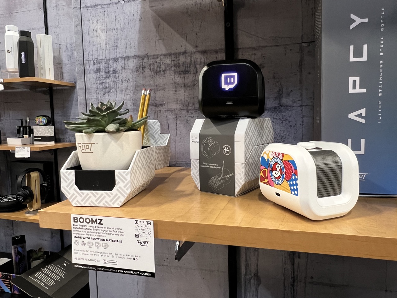 The Rupt booth was hard to miss, with a neon light and head-to-toe shelves of products. What stood out, though, was the fact that the packaging was shown off the same as a bluetooth speaker or the other 30 products Rupt is hitting the market with.