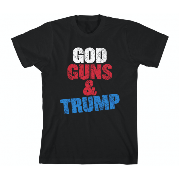 The line includes a T-shirt that says “God, Guns & Trump,” and a hat modeled after Trump’s “Make America Great Again” caps.