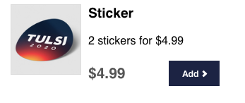Let’s start here with the U.S. Representative from Hawaii. Rep. Gabbard, whose website uses “aloha” plenty and features images of her wearing a lei, doesn’t do as much as she could be with the Hawaiian theme. Her current offering, which is pretty minimal, just features some buttons, stickers, yard signs and T-shirts. All of them except the T-shirt feature the same color-fade design, which is a little reminiscent of a Hawaiian sunset, we suppose.