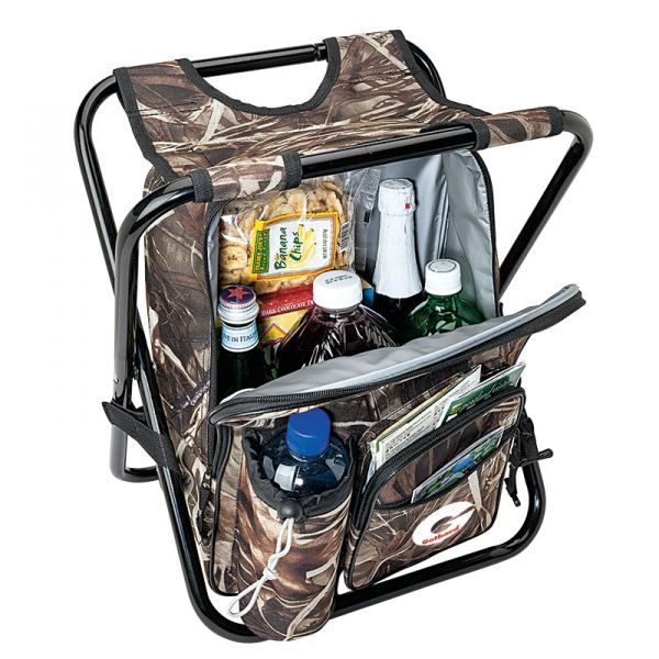 24-can Camo Cooler Chair: Made of 600D material, this cooler/chair includes a zippered main compartment, adjustable shoulder straps, zippered front pocket and water bottle pocket with zip cord closure.