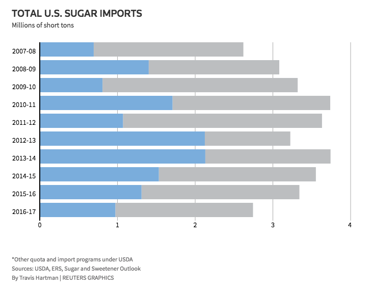 Mexico (in blue) accounts for nearly a third of U.S. sugar imports. (Image via Reuters)
