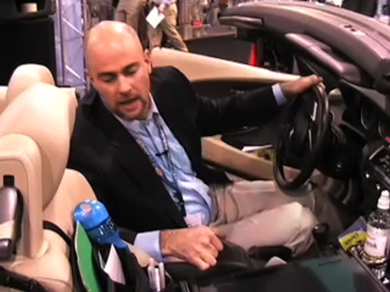 Nothing draws attention to a booth like a new car. Kevin Bart, director of sales, sits in the convertible to discuss his company’s new product for 2007, the AutoExec. The item has been causing a stir at the expo. As business becomes increasingly mobile, people are taking work as they travel. It can be dangerous but the habit can’t be stopped. Mobile Office is addressing the problem by creating a solution that holds items in place and makes the mobile executive safer. If you’ve ever dived under your seat chasing a cell phone that slid to the floor after a sharp turn, you will appreciate this item.