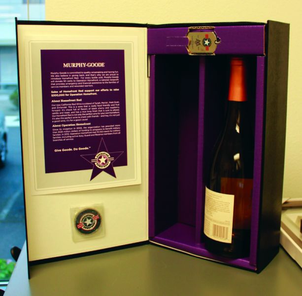 Lisa Mummert: My team and I partnered with Jackson Family Wines to create a custom wine box for the Murphy-Goode Operation Homefront project. The box included a custom molded challenge coin, preloaded dog tag USB and 5×7“ printed card. The wine box itself was branded with a foil stamp and included a custom die-cut insert to hold the USB and two bottles of wine.