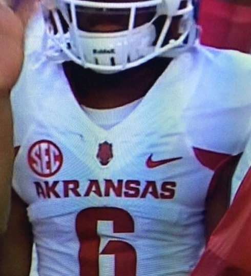 We always remembered how to spell “Arkansas” by first spelling “Kansas” and just adding “Ar.” Easy enough, right? Well, apparently not for Nike. During the University of Arkansas’ game on Saturday against Texas Christian University, ESPN panned over to the sideline and showed Arkansas running back T.J. Hammonds’ jersey, which proudly displayed “Akransas.”