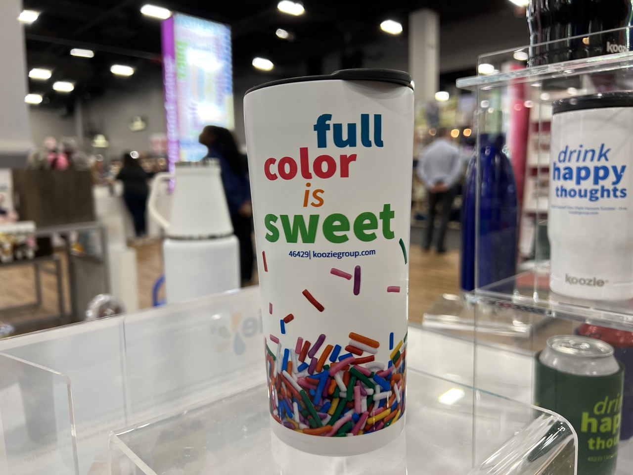 Elsewhere in the Koozie booth, Rosario showed off the Recycled Tumbler, which is also made from recycled stainless steel, but doesn’t hold quite as much liquid as the 40 oz. Big Recycled Tumbler. It also doesn’t have a handle, which allows for top-to-bottom full-color printing.