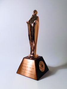 The award represents Salus, the goddess of safety, and was first designed in 1947 as a winged figure. The wings later were removed and the appearance was modernized into the sleek cast statuette used today.