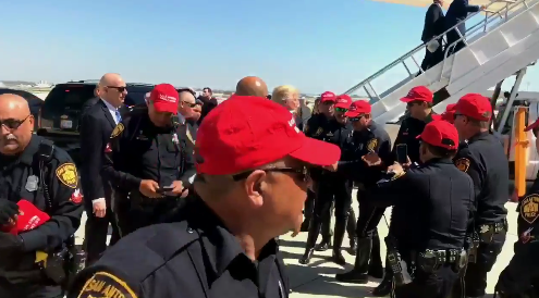 The video shows Trump standing with a group of uniformed police officers on the tarmac at San Antonio international Airport, with at least 14 of the officers wearing the hats.