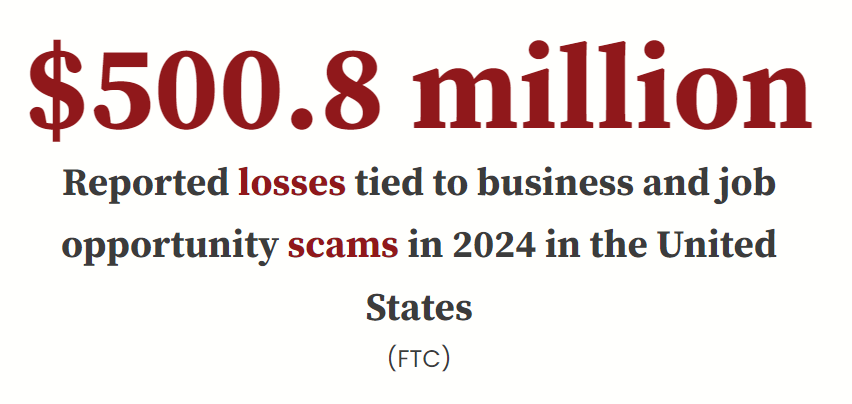 Data from the Federal Trade Commission (FTC) indicates there were 108,459 business and job opportunities scams reported in the United States in 2023. Victims were swindled out of an estimated $500.8 million combined, with the median loss put at $2,169. In the first quarter of 2024, losses reported from nearly 27,500 such schemes had already totaled $134 million, FTC data showed.