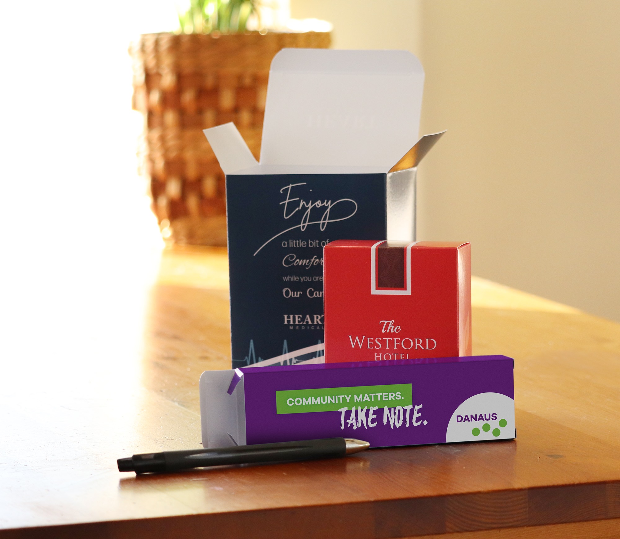 “When people are going to be handing out sunglasses or T-shirts at a trade show, it’s just so much better to put it in something where you can put more information about your company on the packaging than just having the product out on a table for people to grab,” Martin says. “[With] one of our pillow boxes, a lot of people put kits together, and we’ll put multiple promotional items into the pillow box and put it out, it’s really just a way to bring multiple items together.”