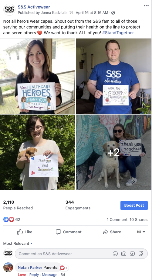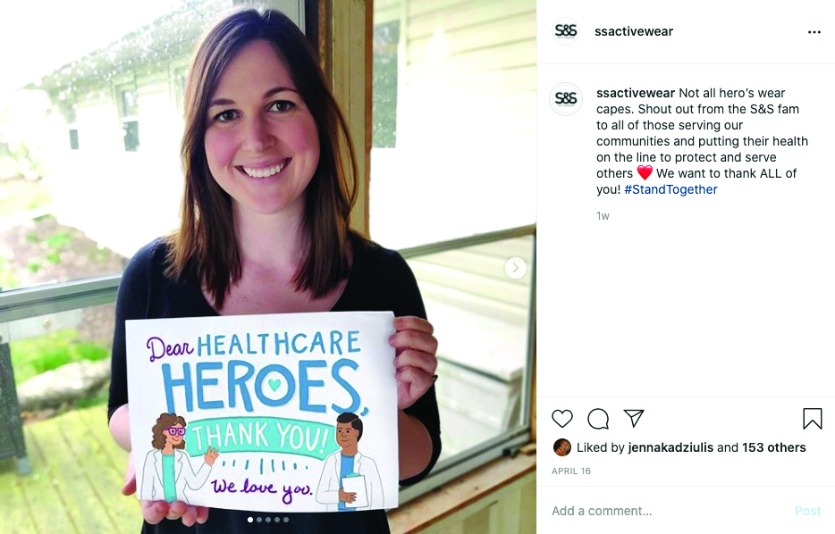 While the S&S team created more of this fun content, they also shared posts highlighting those who are currently fighting on the front lines and helping to keep communities safe. Kadziulis had the team create signs thanking essential workers, then shared photos of team members and their signs.