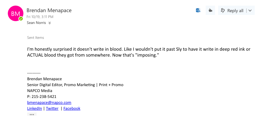 Me? My favorite movie of all time is the promo ad for the Montegrappa Chaos Watch and Pens, which were designed by Sylvester Stallone.