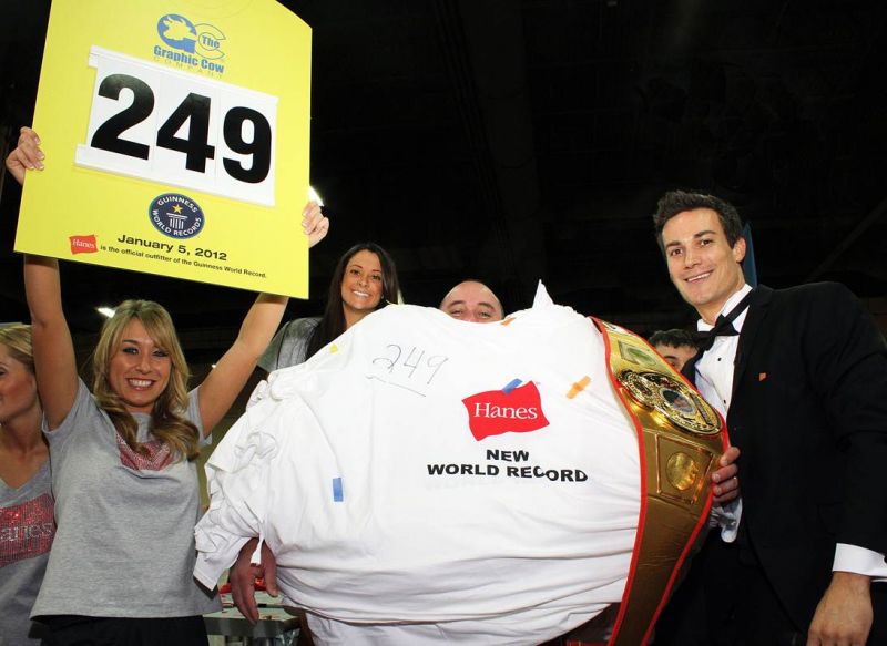 “When we lost the record we set two years ago to the gentleman in Croatia, we knew we wanted to fight hard to get it back,” said David Carter, CEO of The Graphic Cow. “That’s why we decided to partner with Hanes. We knew they had the product selection, technology and sizes to get our title back.”