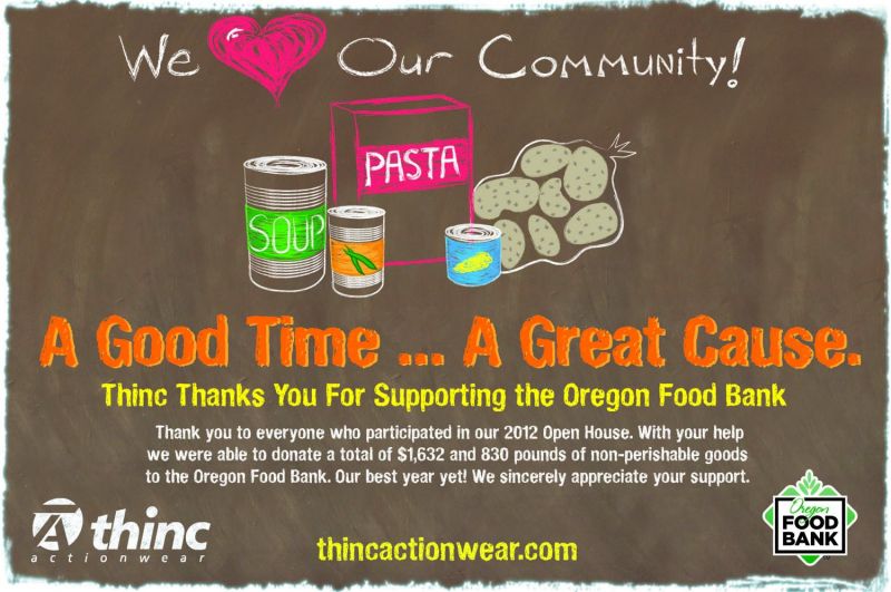 With half coming from the invited guests and half from a matching donation from Thinc Actionwear, the event raised a total of $1,632 and 830 pounds of food for the Oregon Food Bank.