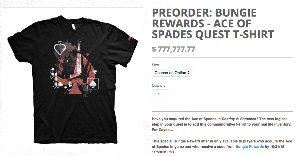 That makes it much more likely that anyone wearing the shirt has actually worked for it. It seems like the only way, actually, as Bungie (the game’s developer) introduced one smart feature: Making it literally impossible to purchase for the $777,777.77 price tag.
