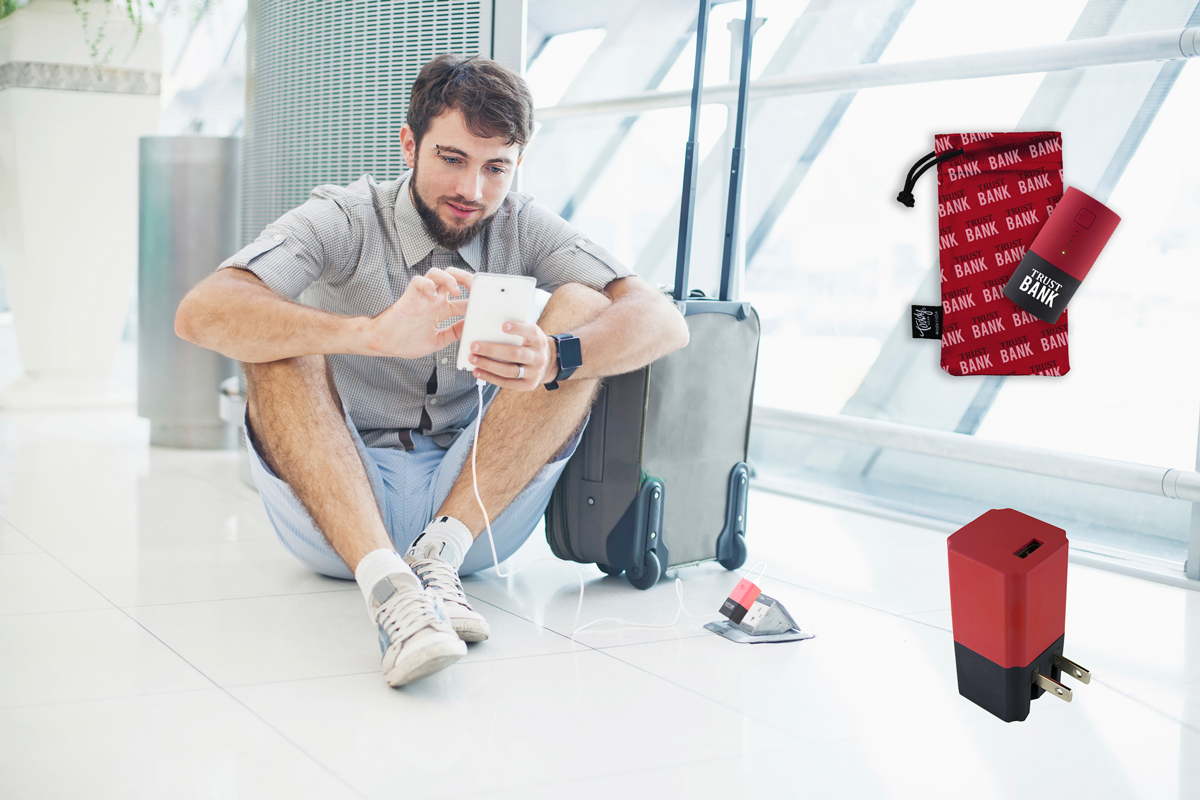 The Smart Charge 2-in-1 Power Bank is a wall charger and portable power bank that recharges devices while it charges itself—no USB wall-outlet adapter needed. A user plugs the USB cable into the power bank to power it up. The wall plug is built-in, and the item recharges itself while charging a mobile device.