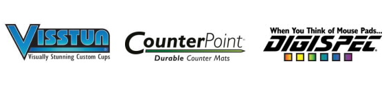 Visstun offers cups and containers, CounterPoint offers point-of-purchase counter mats, and Digispec offers mouse pads.