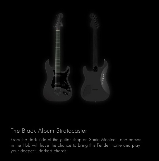 The Black Album Stratocaster, a real-deal Fender Stratocaster completely blacked out and adorned with the Weezer logo and the lightning bolt symbol Cuomo had on an iconic guitar strap.