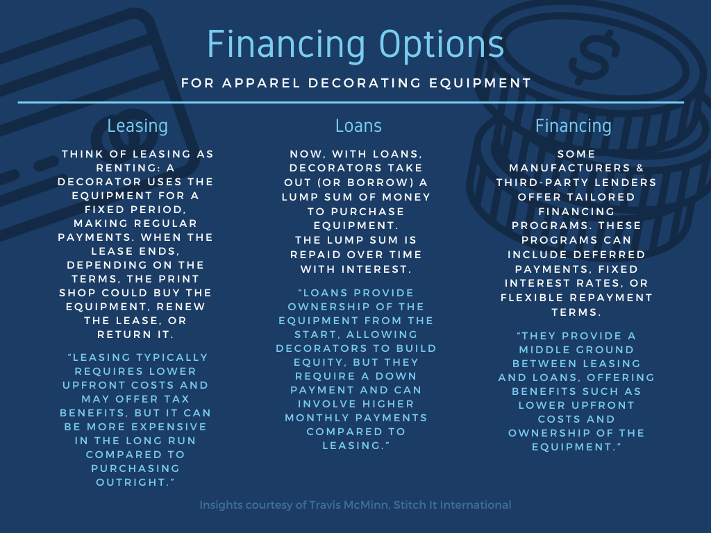 Smaller equipment like heat presses don’t necessarily require or qualify for financing because of the “small dollar volume,” Belk explains. “If cash flow is tight and a new press is needed, a credit card with 0% over a few months is probably your best bet. Otherwise, cash is king.”