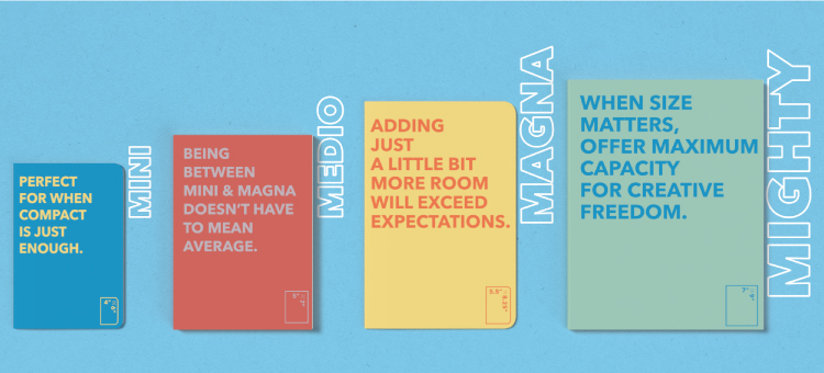 Scribl books are available in four standard sizes: Mini, Medio, Magna and Mighty! A great range of sizes that will satisfy any appetite! You may also choose from square or round book corners for either an edgy, linear appearance or a softer, more casual look.