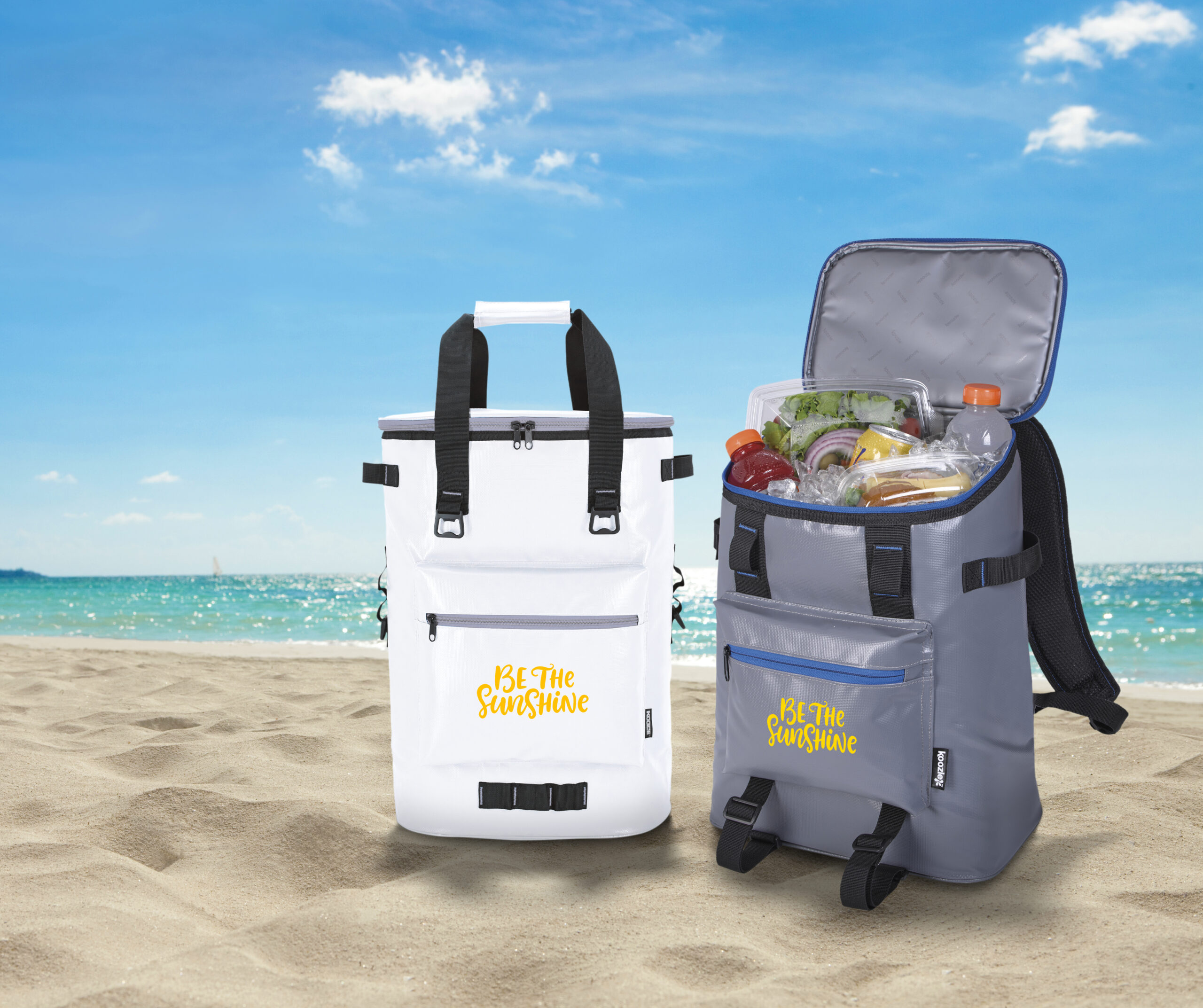 Map out your next adventure, then pack up an Olympus cooler backpack for a day of carefree roaming. Available in 24-can (Item #16190) and 36-can versions (Item #16002), both have a wide zippered main opening for easy loading, and, of course, feature great organizational aids, including daisy chains, an attached bottle opener, and a large front zippered pocket. The star of the show, however, is the mesh, padded, adjustable backpack straps. Chelsea Williams, Owner/CEO of Spark Branded Solutions, says the larger style is one of her favorite pool-side promo products.