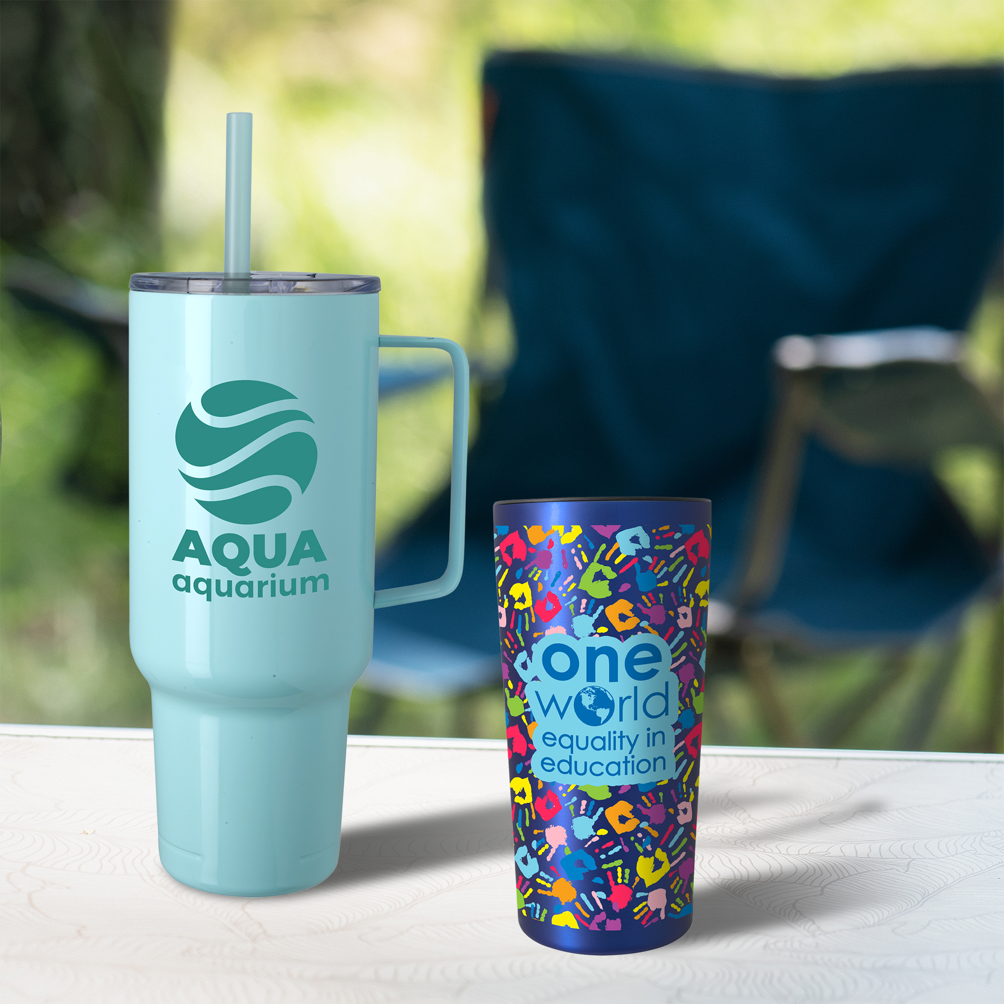 Since 2020, we have greatly increased our number of products containing recycled/renewable content from 100 to 600+. We’ve even made recycled content and water bottle equivalency certificates available on product pages on our website. Some exciting new products that have been created from recycled materials include two tumblers that are made with 90% recycled stainless steel and sport 100% recycled plastic lids. The #46434 Koozie Big Recycled Tumbler – 40 oz. is perfect for long road trips and features double-wall vacuum insulation to keep drinks hot or cold for hours, plus a large comfort handle and tapered base that make transporting the tumbler a breeze. The #46429 Koozie Recycled Tumbler – 16 oz. also features double-wall vacuum insulation and can hold 16 ounces with the lid on or 19 ounces when filled to the rim.