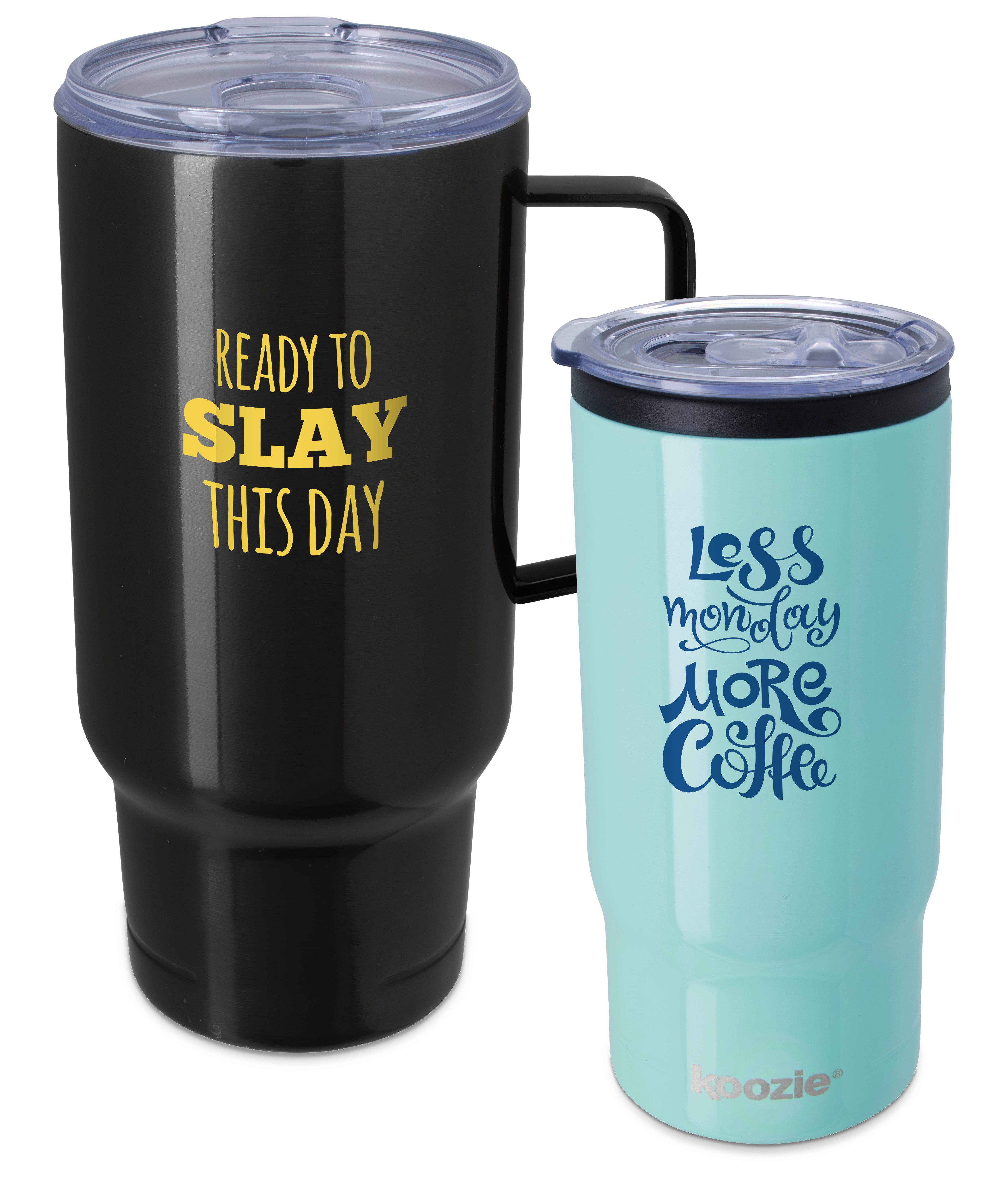 Rev up your morning commute with the Koozie® Handle Tumbler – 30 oz. This multipurpose double-wall vacuum-insulated tumbler works as hard as you do, fitting nicely into your hand as well as into a cup holder. Use it as a tumbler with the push-on, spill-resistant lid with slider, or if a trip through the drive-thru is on your agenda, remove the lid and place your to-go cup in it to prevent sweating.