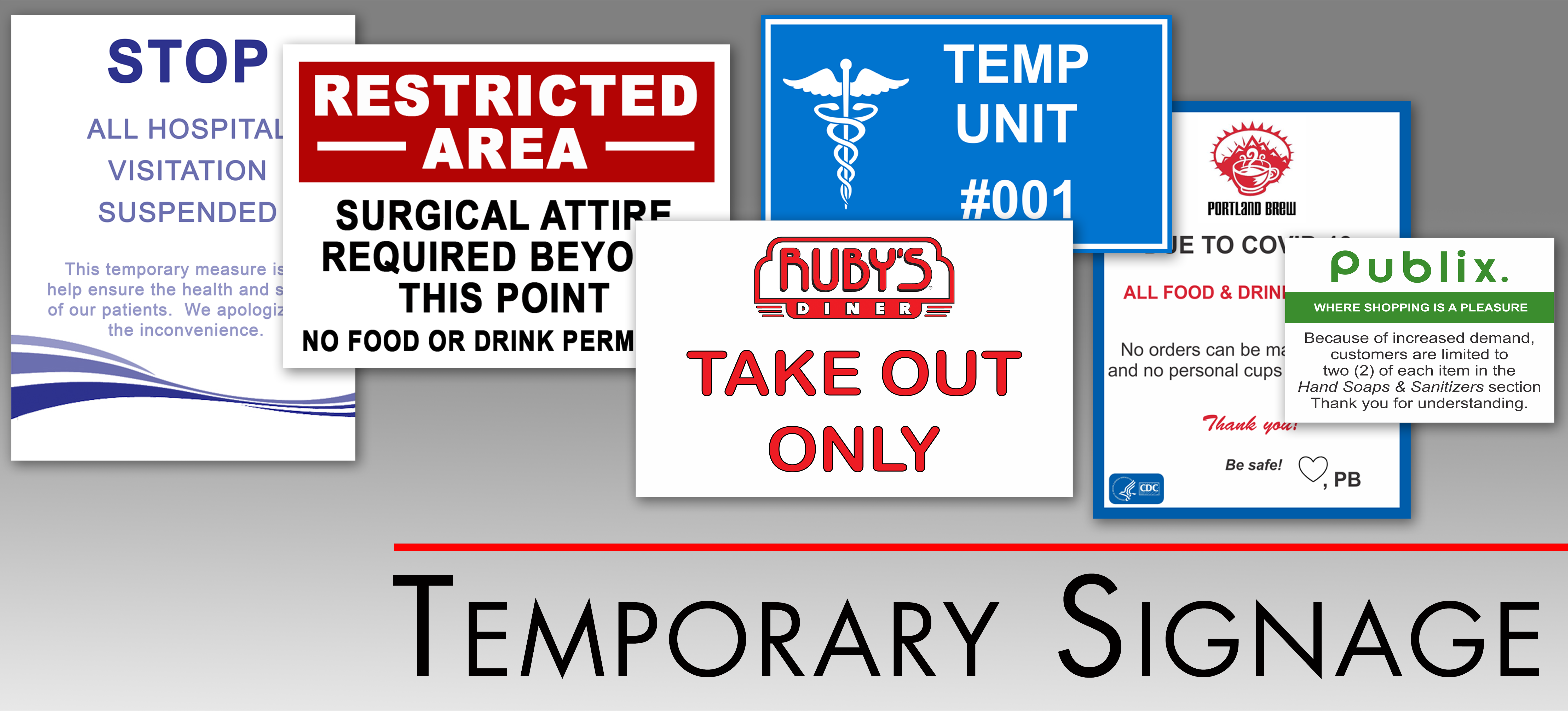 Temporary signage needs have grown in recent weeks as well. Many businesses and hospitals/clinics have a need for quick, economical and temporary sign solutions. From thin laminated plastics to thicker, more durable reverse printed acrylics, we have been busy fulfilling many of these needs.