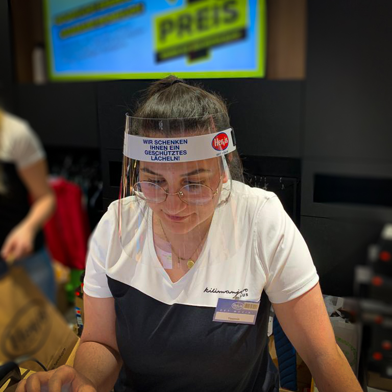 The upper bar of the Vision 1 face shield can be fully customized. The area is 10.0” x 1.2”, and we are happy to add your company’s logo, a slogan, a motivating message, etc. Hervis, an Austrian Sports Retailer with 200 stores, added a beautiful message: “We help you with a safe smile.”