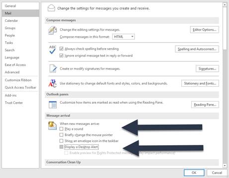 Under “Message Arrival,” clear the “Display a Desktop Alert” check box, and then select “OK.” Clear all other notifications such as sounds, mouse pointer changes or displaying an envelope icon in the taskbar.